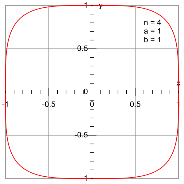 When the values of a and b are equal and n is set to 4, the result is a geometric figure that seamlessly blends the rigid corners of a square with the continuous curves of a circle. The equation becomes:
